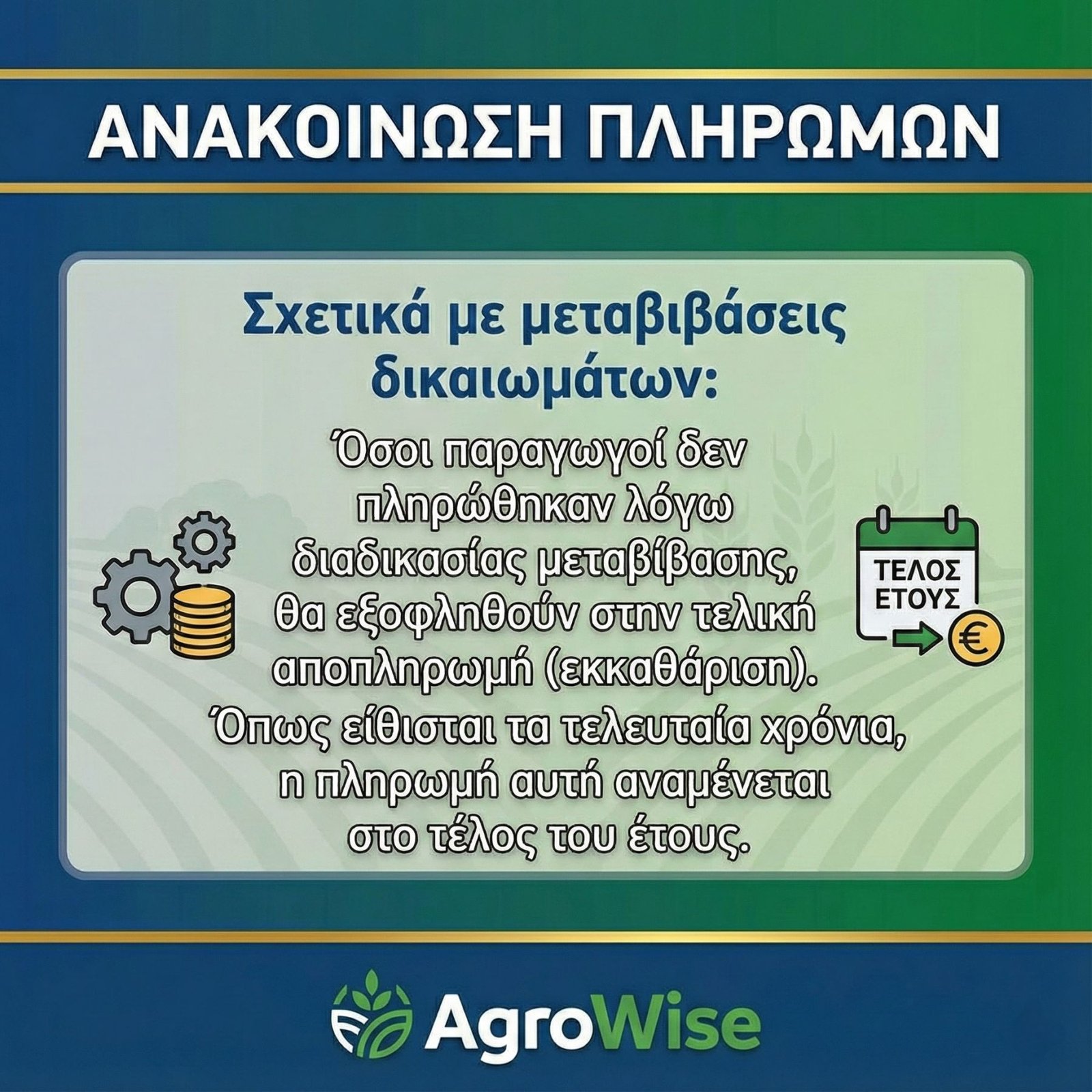 Πότε θα πληρωθούν οι μεταβιβάσεις δικαιωμάτωνPost author:agronewsbombPost published:03/12/2025Post category:Επιδοτήσεις / Καυτό / ΠληρωμέςΕνημέρωση για τις πληρωμές στις μεταβιβάσεις δικαιωμάτων από τις “Συμβουλευτικές Υπηρεσίες – Περουλάκης & Συνεργάτες”.Όπως αναφέρει: “Όσοι δεν πληρώθηκαν επειδή μεταβίβασαν δικαιώματα, θα πληρωθούν στην αποπληρωμή”. Tags: δικαιώματα, μεταβιβάσεις, πληρωμέςRead more articles Previous Post«Ανάγκη άμεσης πρωτοβουλίας παγώματος των αγροτικών δανείων» Next PostΛυκουρέντζος: Περίπου 65% των αγροτών συναίνεσαν σε παρακράτηση βασικής για πληρωμή ΕΛΓΑ You Might Also Like Οι μεγαλοστομίες περί ετοιμότητας του δήθεν επιτελικού κράτους έχουν καταρρεύσει20/08/2023 Παρέμβαση ΥπΑΑΤ για την τιμή στο ροδάκινο ζητά η δήμαρχος Σκύδρας08/08/2024 Έχασε 370 ζώα και τον άφησαν χωρίς αποζημίωση και βιολογικά21/02/2025